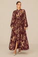 Elevate your wardrobe with the Aitana Metallic Print Puff Sleeve Maxi Dress. Featuring a versatile two-way design and an included belt, seamlessly switch between an A-line or tent silhouette. Available in brown, sizes XL and XXL.