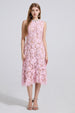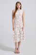 Sleeveless, Floral Lace Overlay, Pearl Embellishment, Flared Hem, Midi Length.