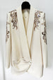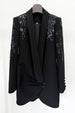 Sequin Shoulder Applique, Shawl Collar, Long Sleeves, Asymmetric Hem, Mini Length.
