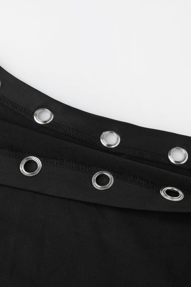 The perfect concert fit has arrived! Introducing the Live Loud Long Sleeve Mini Dress in Black. Features one shoulder neckline with silver eyelet detailing, long flared sleeves, mini length, high stretch fabrication and lined.