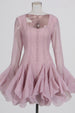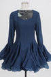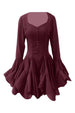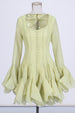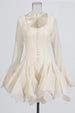Long Sheer Sleeves, Sweetheart Neckline, Button-front Detail, Asymmetric Ruffled Hem, Mini Length.