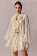 V-neck, Dramatic Puff Sleeves, Flared Cuffs, Semi-sheer, Floral Appliqué, Ruffled, Tiered Skirt, Elastic Waist Band, Low Waistline, Mini Length.